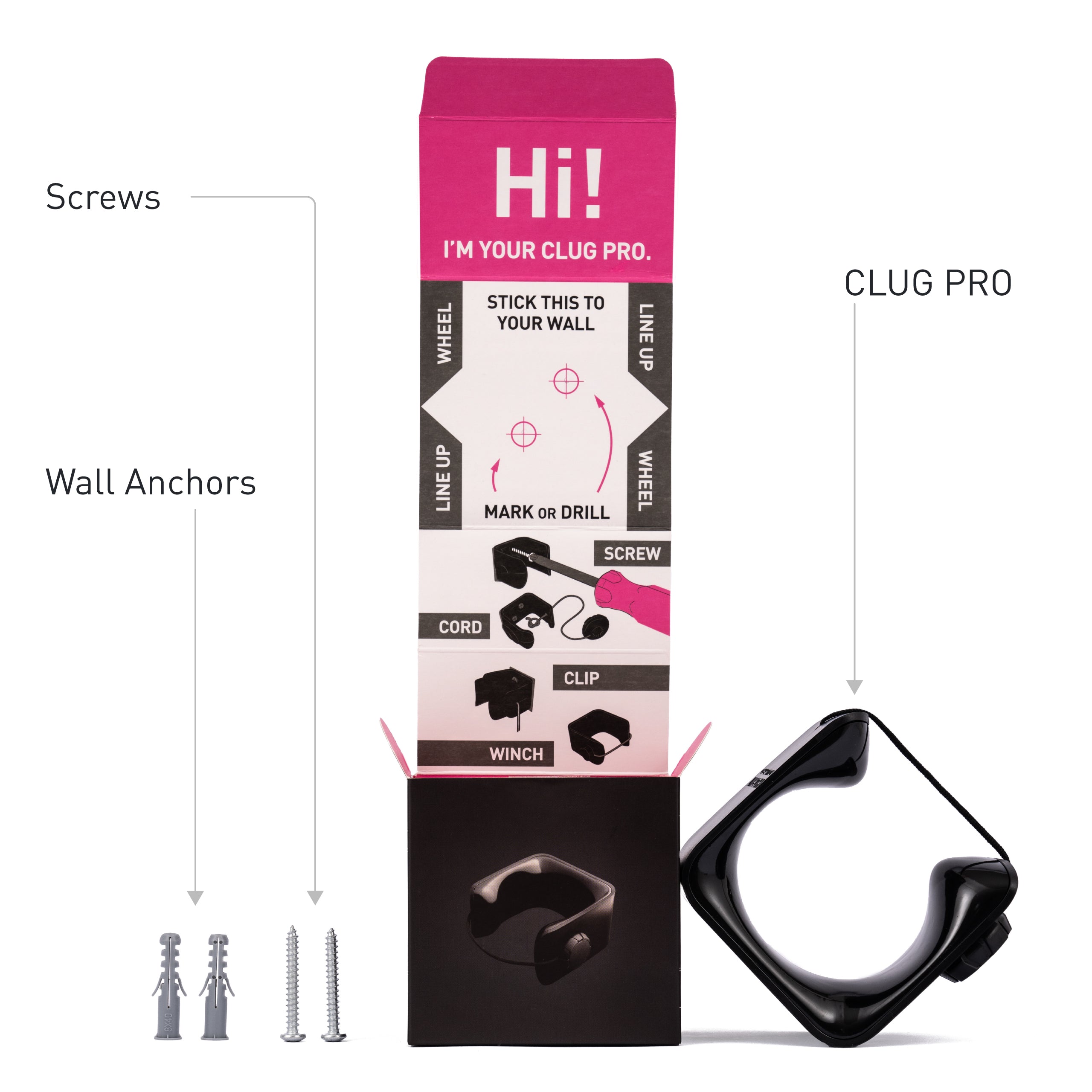 It’s super simple! Just follow the instructions inside the box or check out the link below to view the steps online. CLUG PRO fixes in place with two screws (screws and wall plugs are included). You’ll be up and clugging in no time.