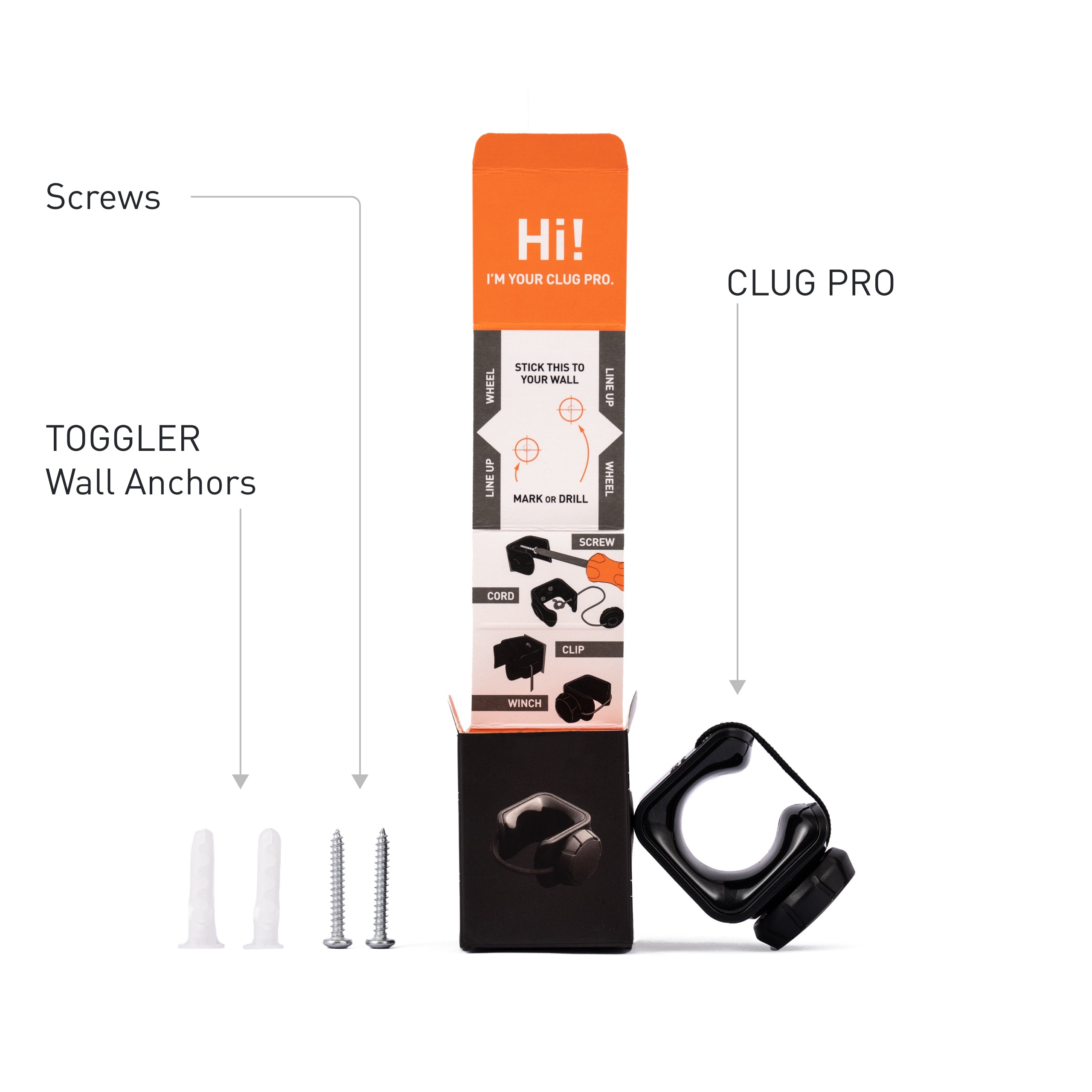 It’s super simple! Just follow the instructions inside the box or check out the link below to view the steps online. CLUG PRO fixes in place with two screws (screws and wall plugs are included). You’ll be up and clugging in no time.
